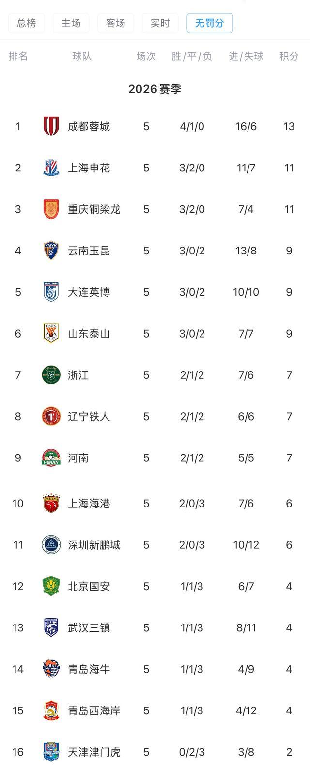 股票配资开户网站 中超5轮过后“无罚分”积分榜:蓉城第一申花第二 津门虎依旧垫底